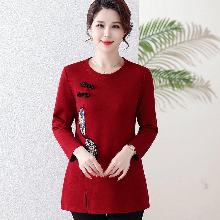 2024秋の新型ファッションのゆったりした雰囲気の新しい中国風の丸首のプリントの中の長いタイプのお母さんは底のシャツを詰めます。