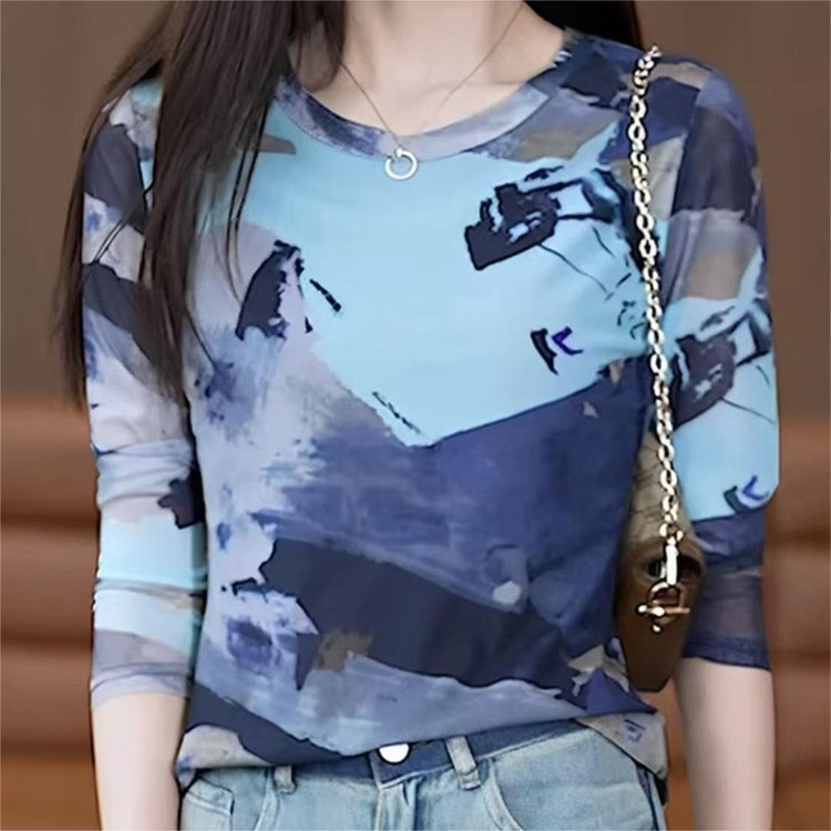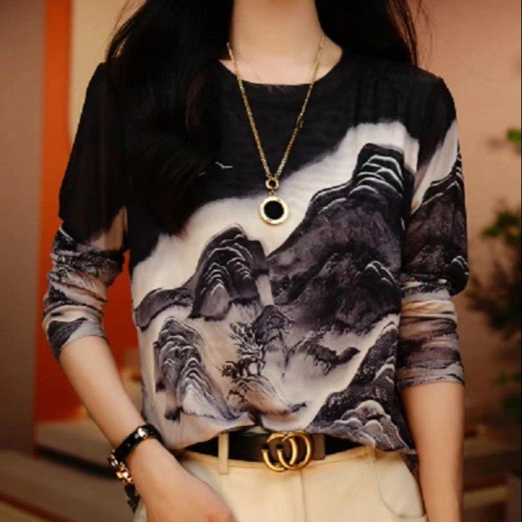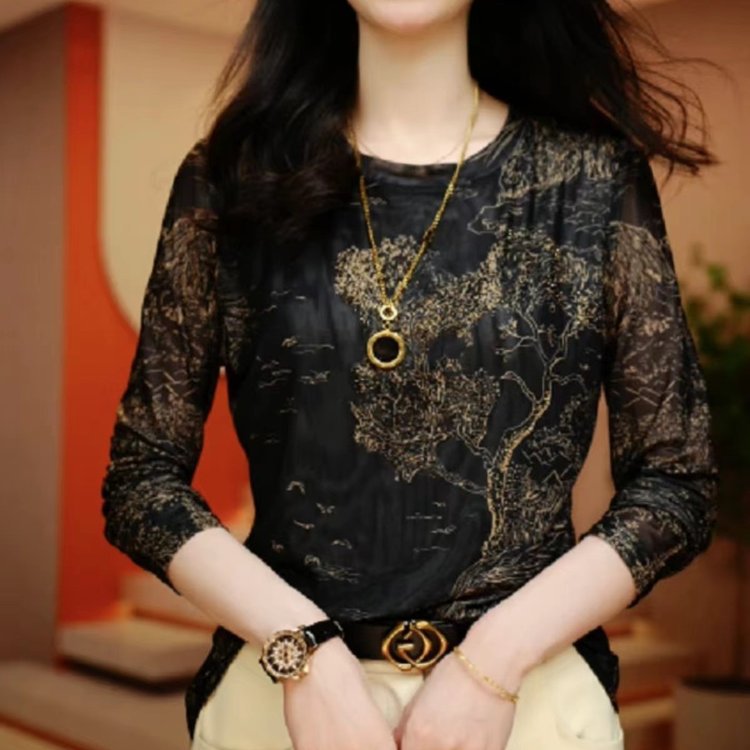 秋の新型の底のシャツの2024ファッションのプリントのフランス式の年齢を減らします長袖の肌の紗の丸首の洋気のお母さんのtシャツ