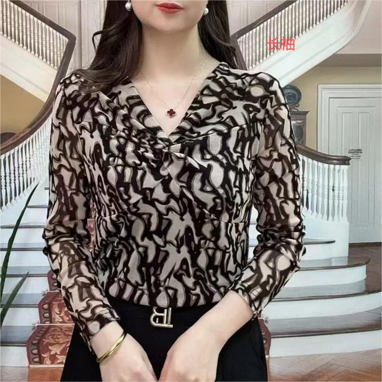弾力性ネットの底のシャツの2024秋のタイプはしわのプリントのvネックの長袖のゆったりしている気質の百合の年齢の上着を引き抜きます。