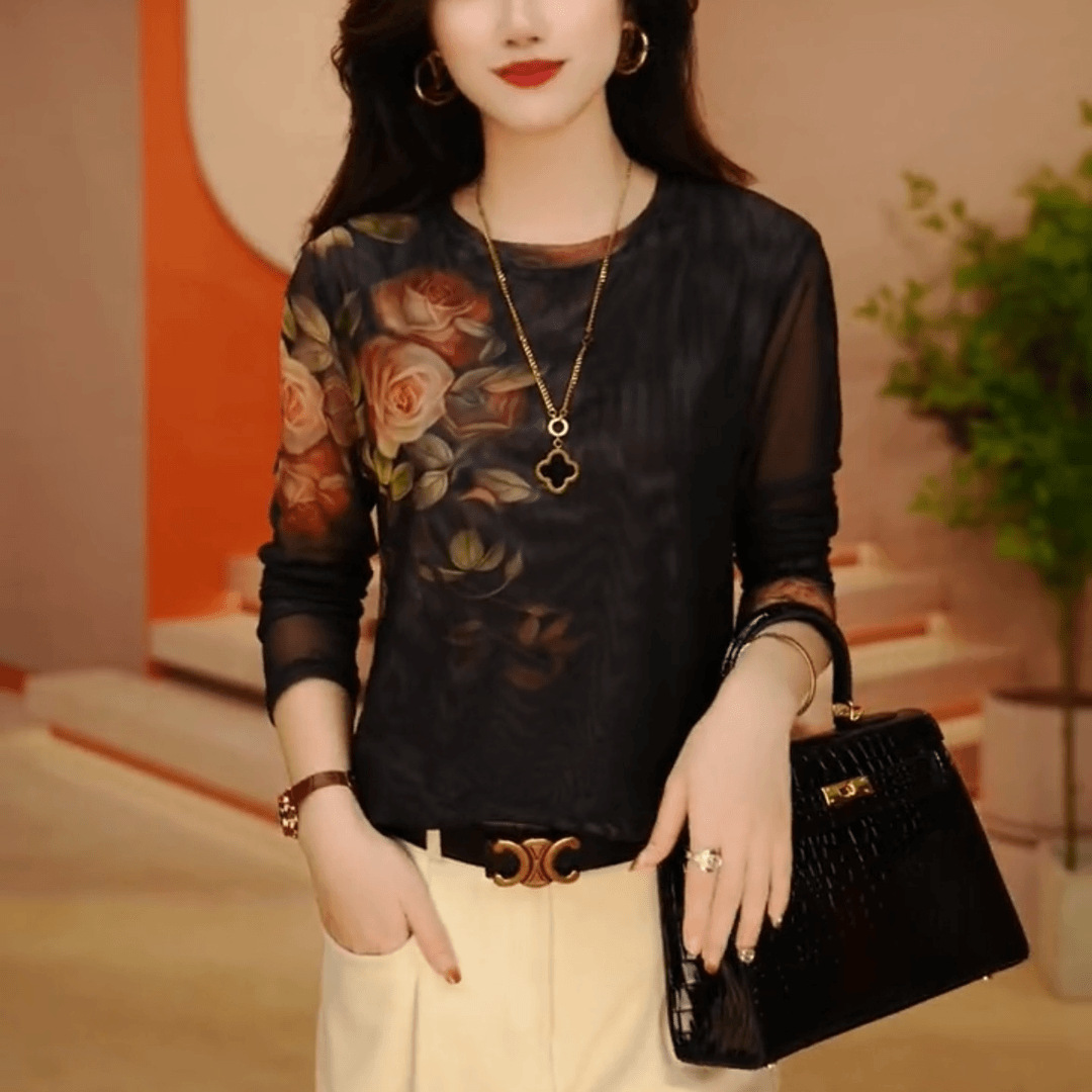 2024秋の新型ファッション気質百合減齢プリント長袖の優雅で贅沢なボトムtシャツの上着のファッション