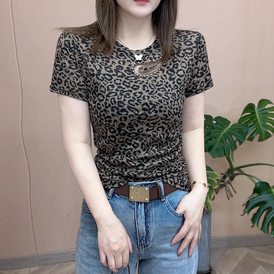 抖音で話題の2024年夏新作、おしゃれでゆったりとした透かし彫りのヒョウ柄プリントが特徴の、万能な半袖Tシャツトップス