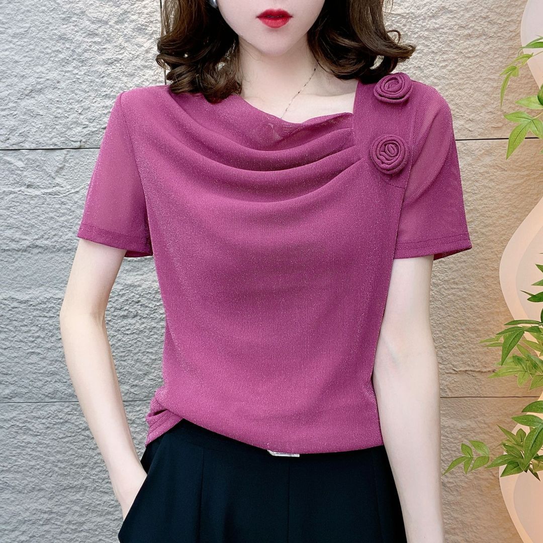 ディザトーンの爆発金2024夏のファッションの積み重ね襟の弾力性ネットのガーゼの洋気の百合減齢半袖tシャツの上着