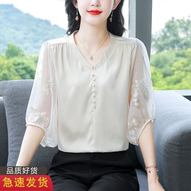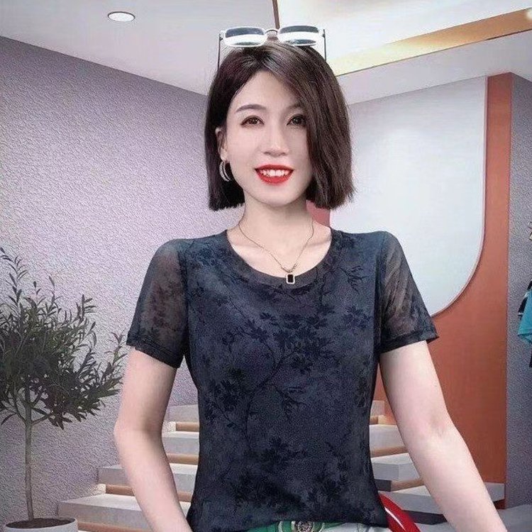 ネット赤半袖2024夏のファッション丸首気質肌糸薄い通気半袖tシャツ上着女装