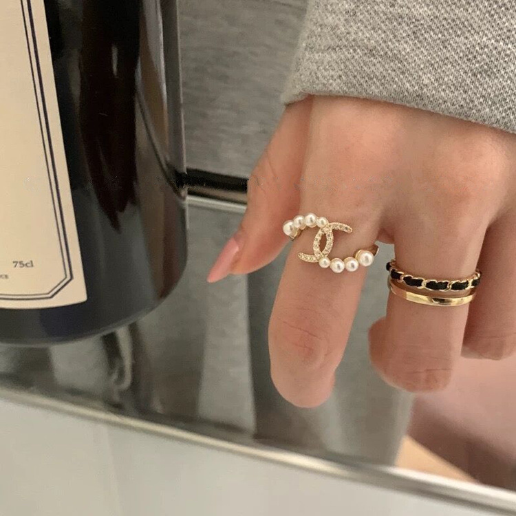 小香风珍珠字母戒指C戒指黑皮双层戒指女韩国小众设计感时尚简约