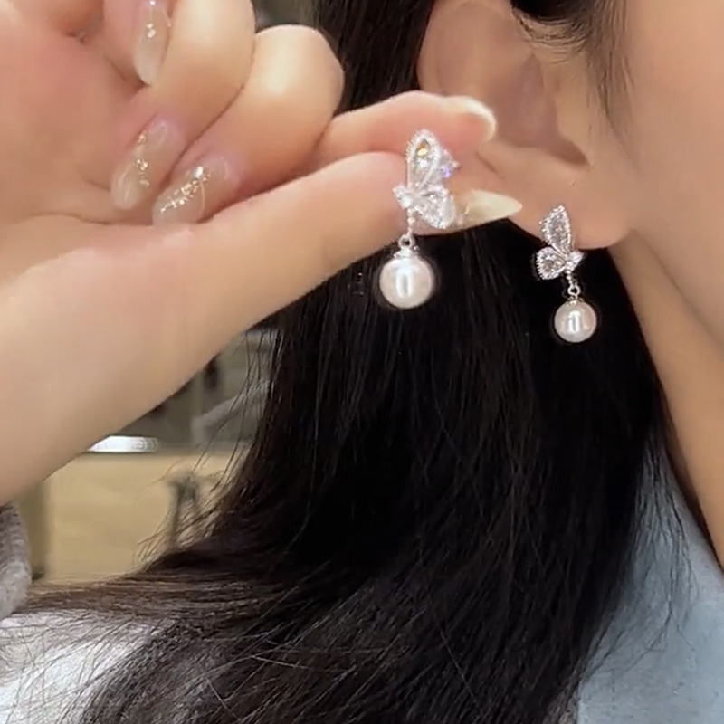 高級感ジルコン蝶真珠イヤリング軽豪華小衆設計大胆ピアス2023新型爆金耳飾り