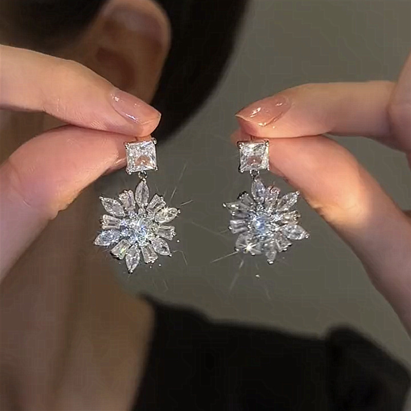 銀色の軽贅沢ジルコン雪花イヤリングs925銀耳針起爆軽贅沢耳飾り夏高級感氷菱花