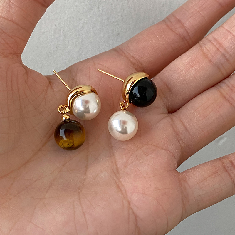 美ラード非対称虎眼石真珠イヤリングS925銀針シンプル気質ピアスレトロ高級女性イヤリング