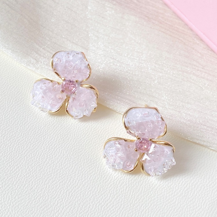 ピンクの花のイヤリング三弁の花の気質のグラデーションの粉の気質の粉の結晶石の花のピアスの女性の甘いイヤリングのイヤリングのイヤリング