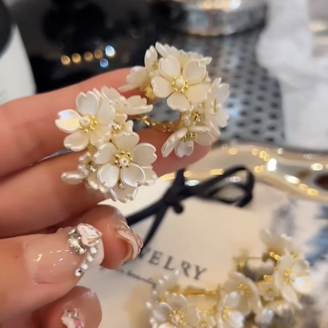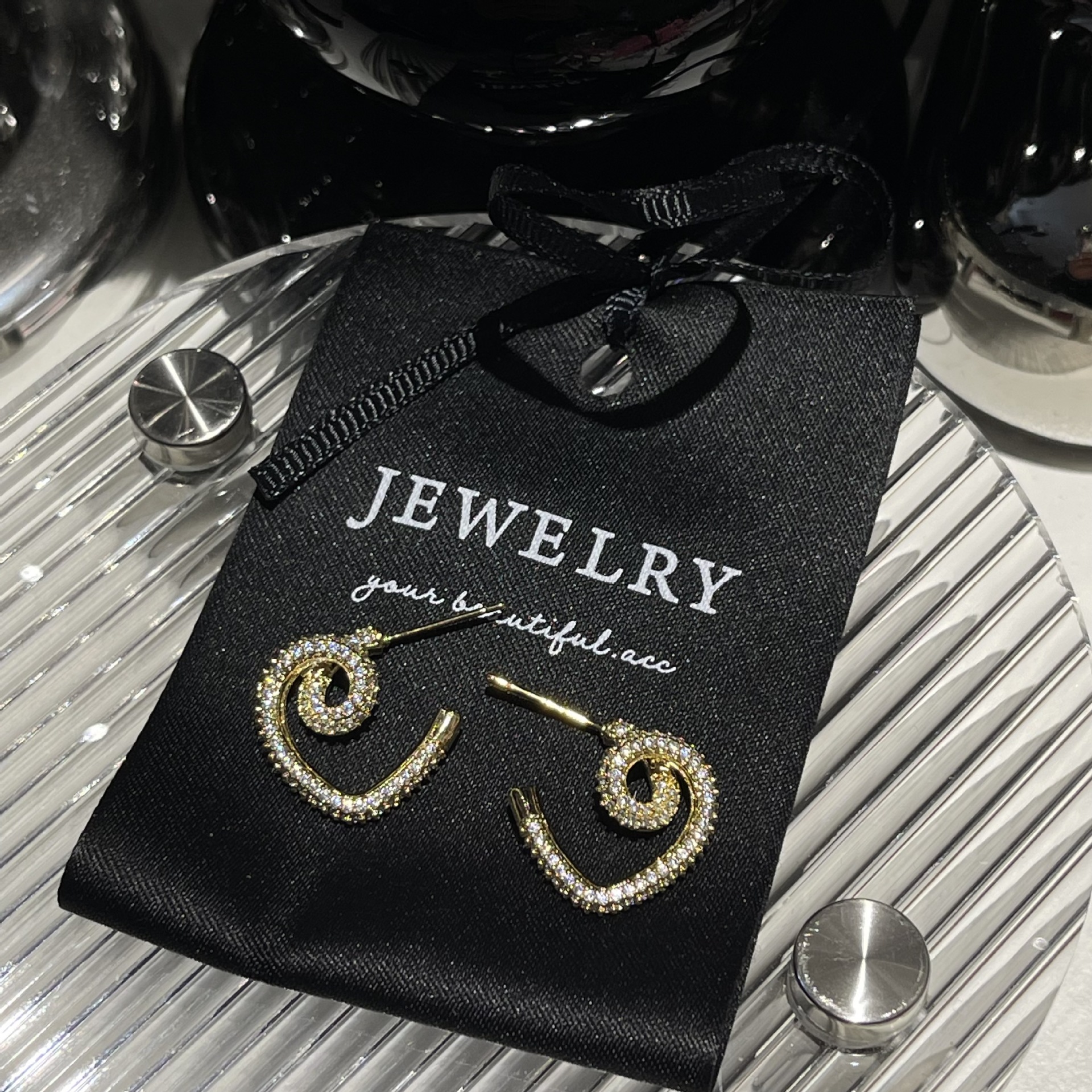 ジルコンを入れて、愛のピアスを曲げます。s925銀針独特のイヤリングの高級感があります。