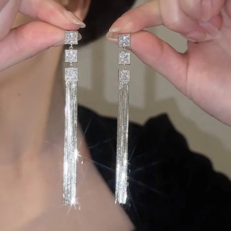 角型フラッシュドリルジルコン流蘇イヤリング高級感重工精致女性軽豪華百合個性気質ファッション耳飾り