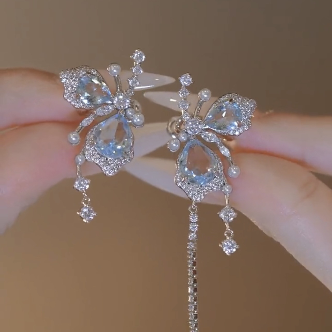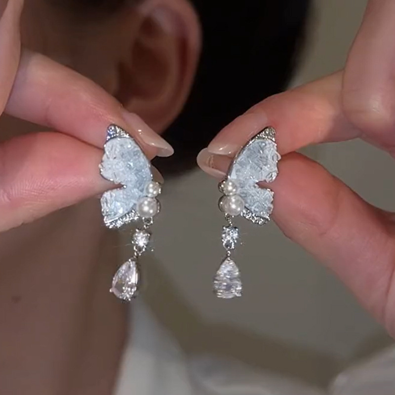 超仙グラデーションブルー水晶蝶イヤリング小衆デザイン高級感優しさ