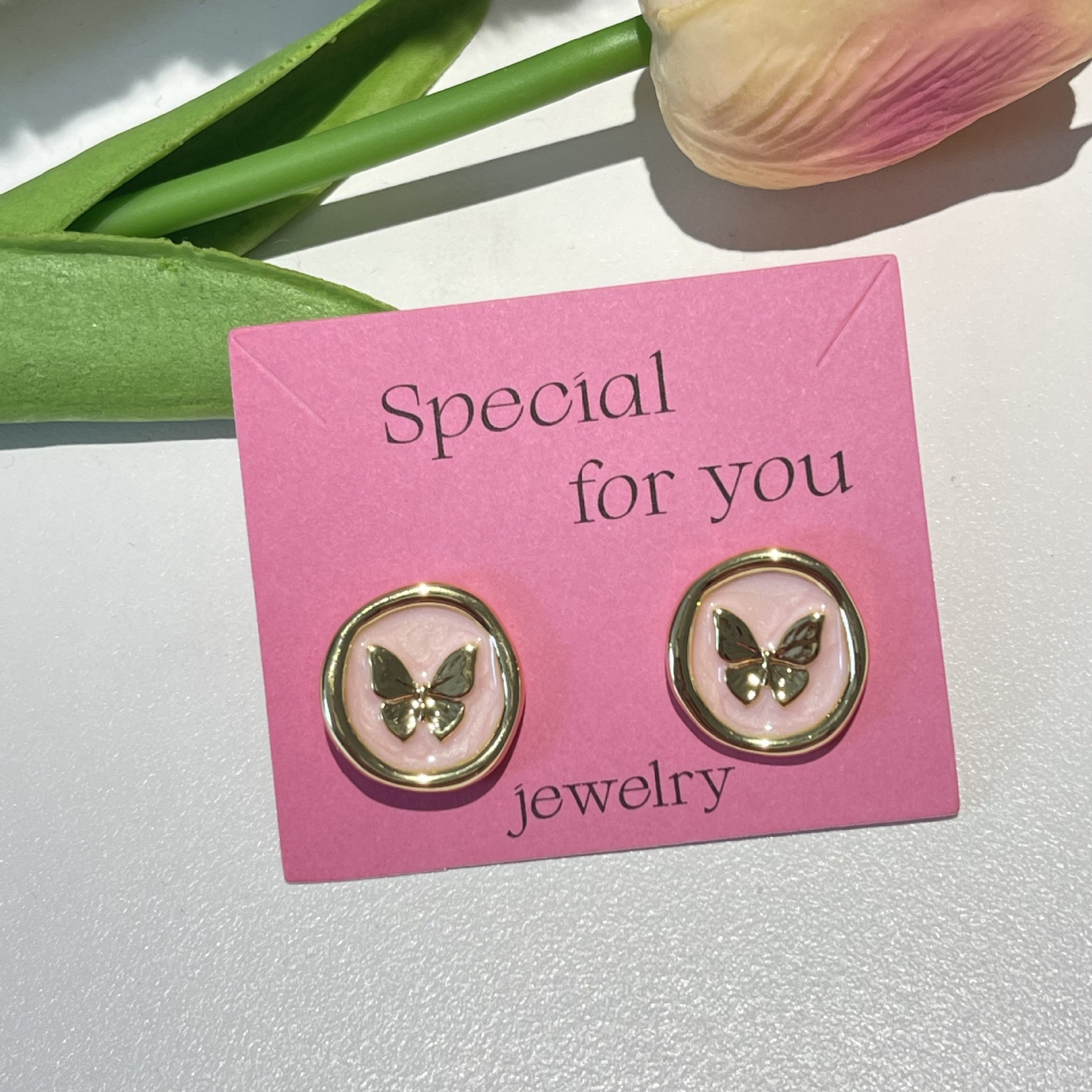ピンク蝶円形気質金属風S925銀針春日滴油小清新甘いかわいいイヤリング