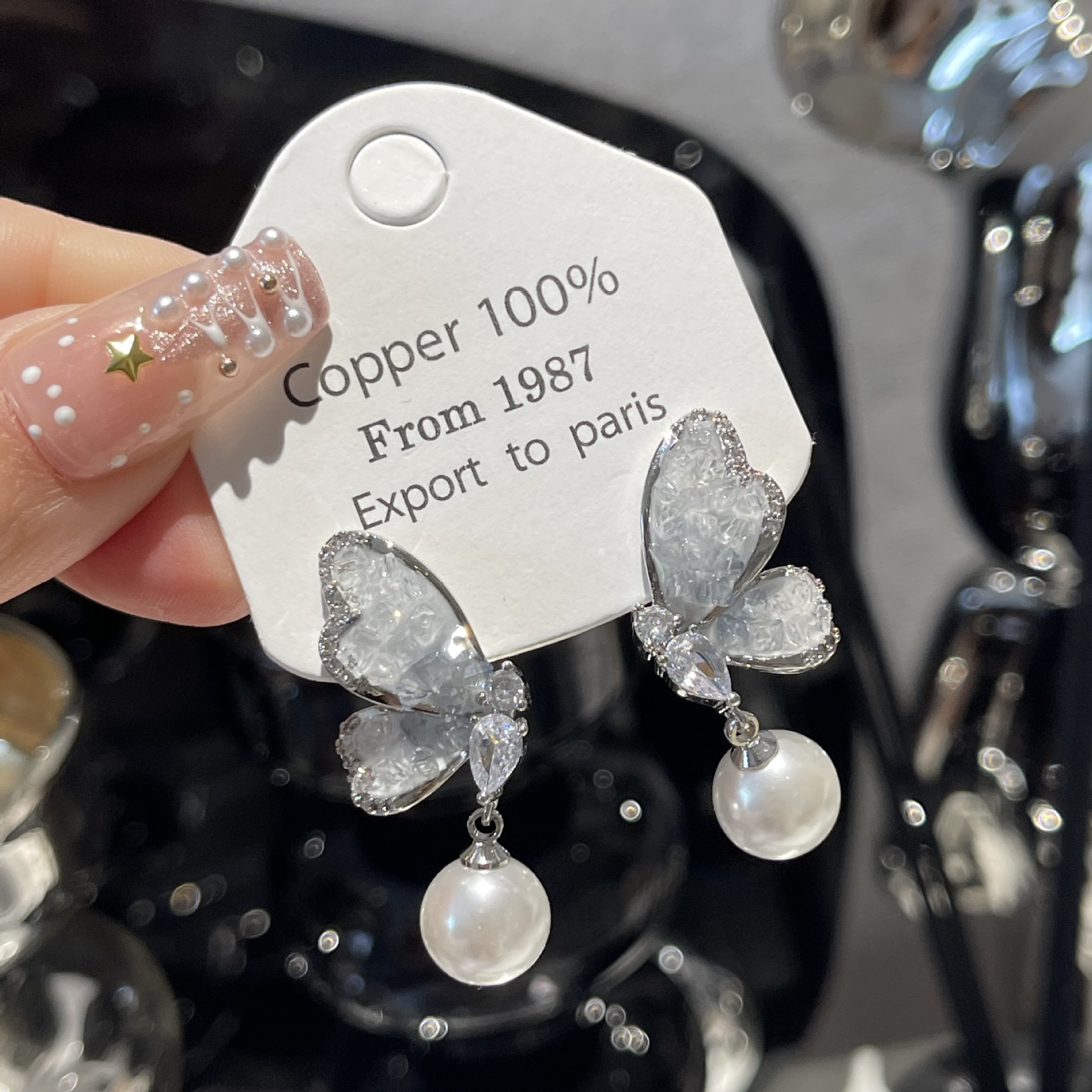 グラデーションブルー蝶真珠ピアスs925銀針淑女小清新ファッションクリアブルー水晶蝶真珠