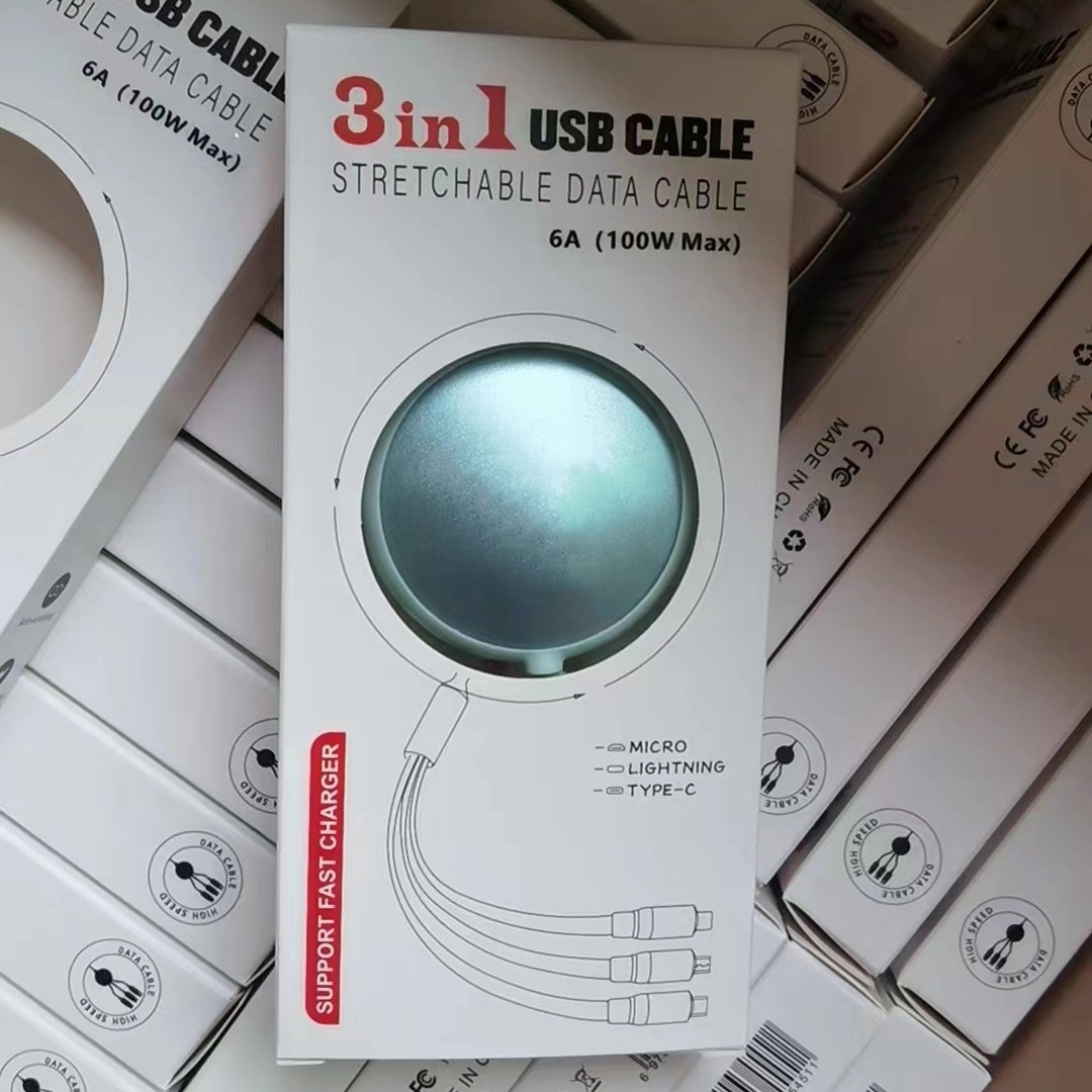 多頭充電線カラーボックスのブリスター包装は、3つの伸縮ケーブルをドラッグして窓を開けて展示します。