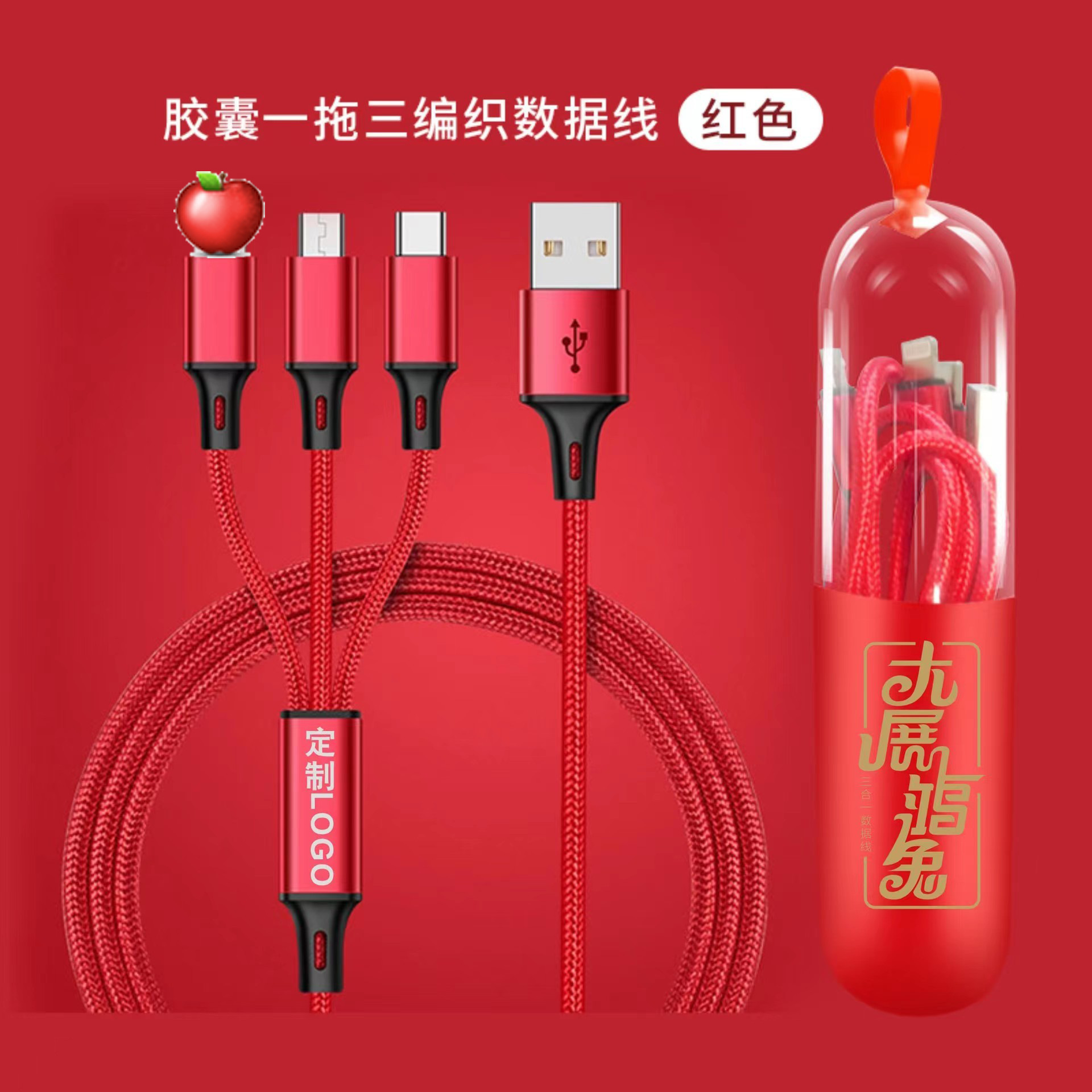 Usb一モップ三充電線赤いお祝いビジネスプレゼントデータ線延長カプセル包装はロゴを決めることができる