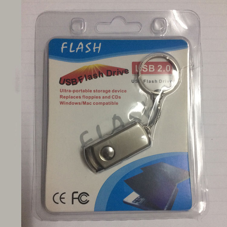 回転式リング付き小型USBメモリ、透明ブリスター紙カード折りたたみ包装、既製品、ロゴデザイン・レイアウト印刷対応