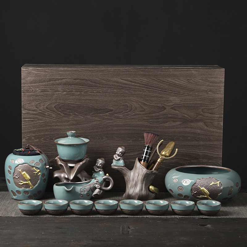 哥窯自動茶器セット家庭用陶磁器怠け者の工夫茶器蓋ティーポットセットお土産