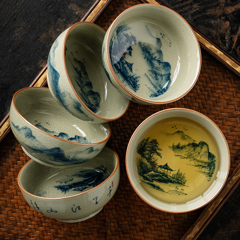 古い陶泥プーアル杯手描き青花圧手杯山水品茗杯千里江山主人杯高級プレゼント