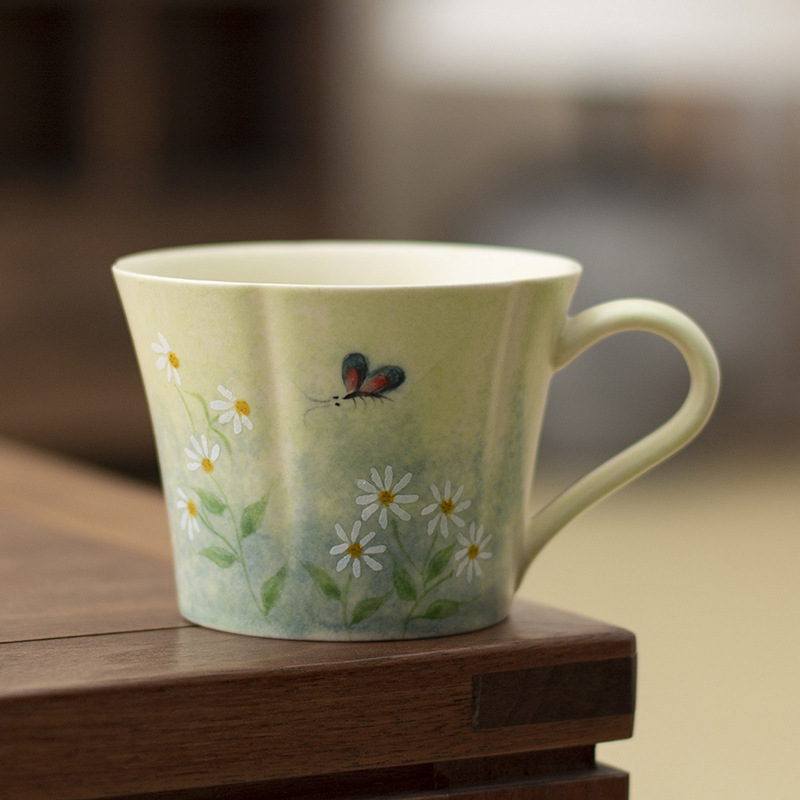 手描きのコーヒーカップ、下絵色のデイジー、高価値のセラミックウォーターカップ、女性用ホームアフタヌーンティーカップ、ライトラグジュアリーブティック