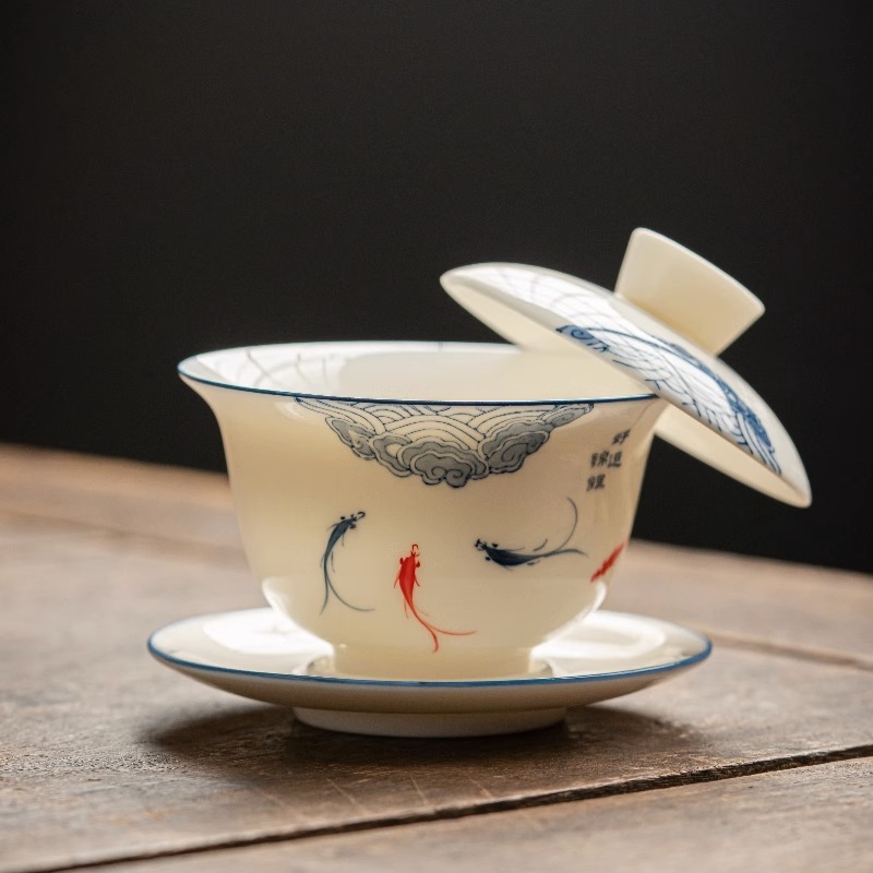 羊脂玉の手描き三才蓋碗の高級家庭用は手を温めません。