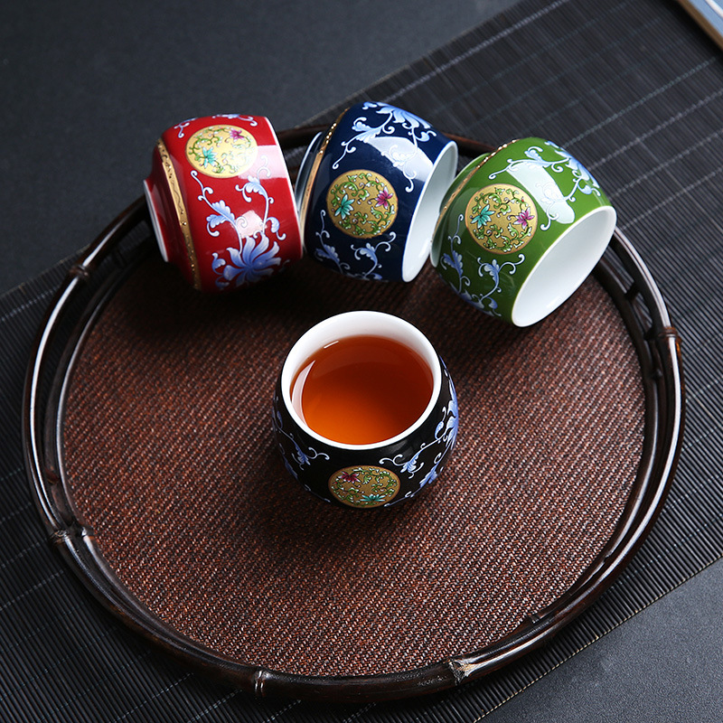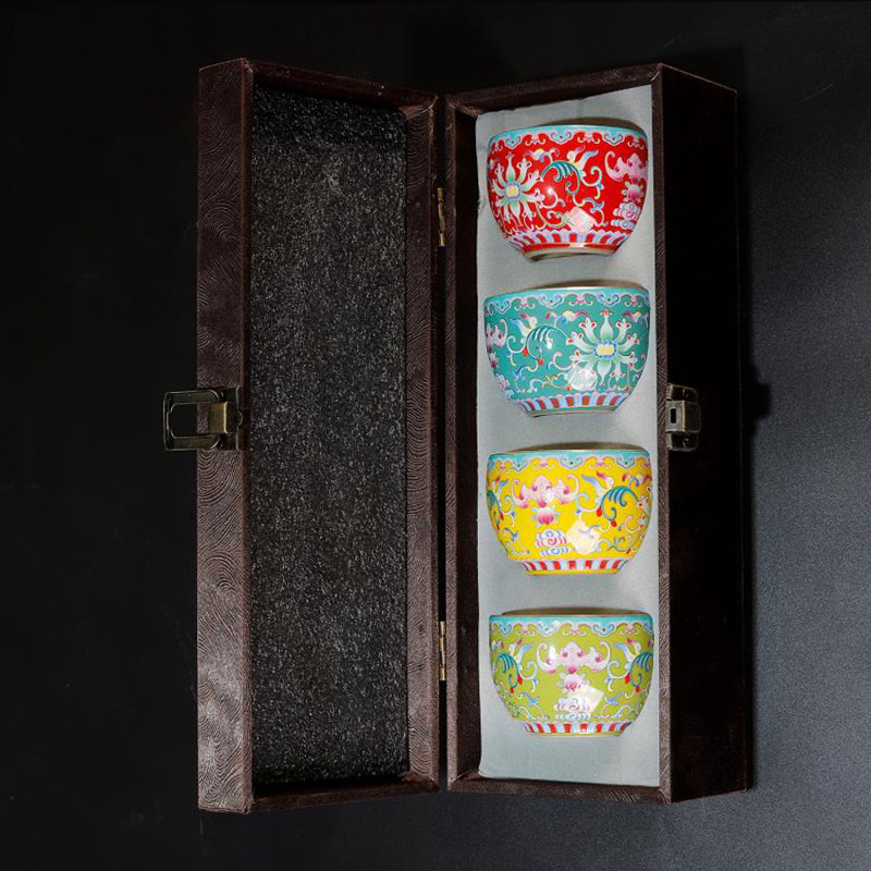 四色のお茶のコップの陶磁器のエナメルの彩色品茗杯の工夫の茶器の茶碗の家庭の主人の小さいコップの礼箱