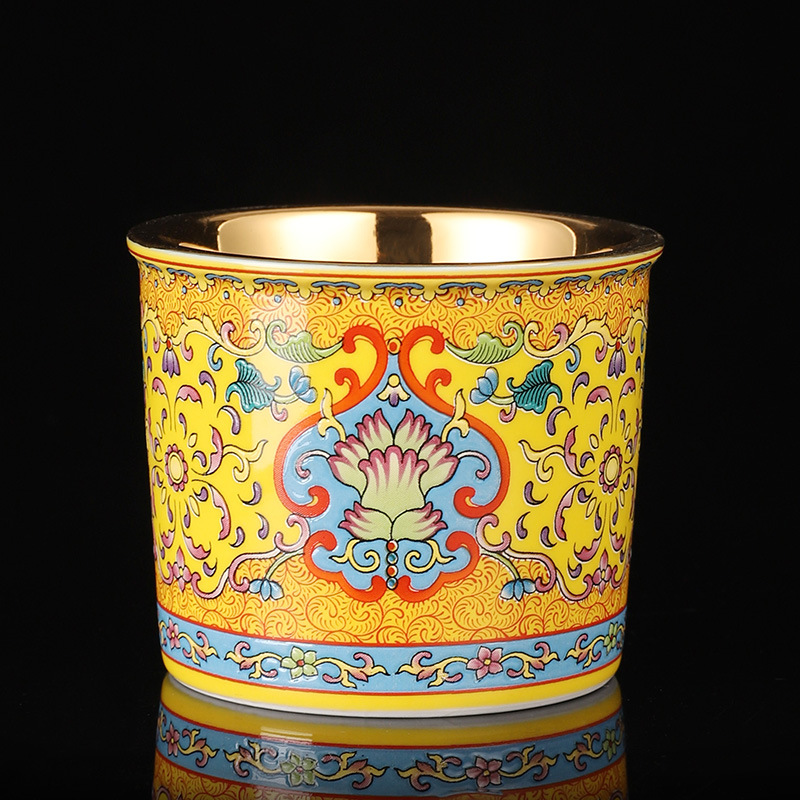 エナメル色24k純金茶杯陶磁器内胆金工夫茶具純手作り金杯高級主人茶杯
