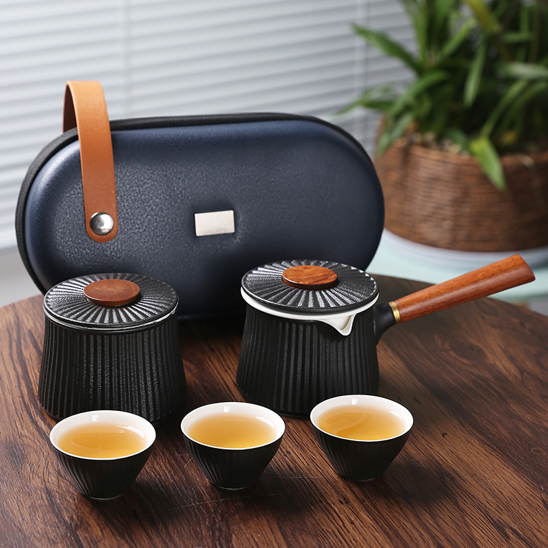 旅行茶器セット携帯バッグ一本三杯快客杯車の工夫が屋外でティーポットのロゴを持っている