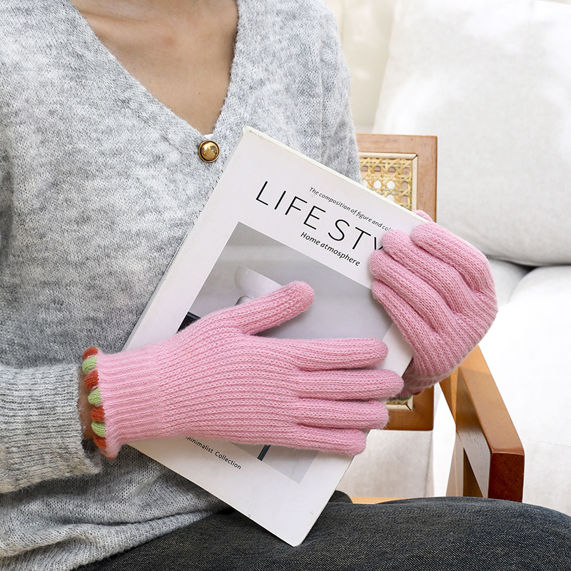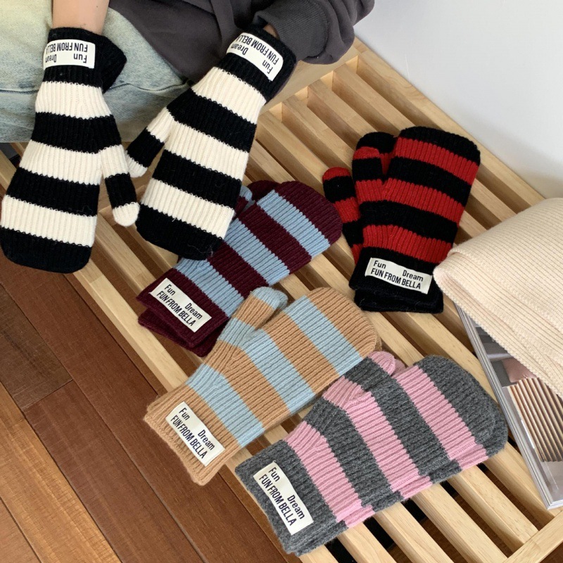 2024新型ニットストライプ韓国版女性保温騎乗防風学生手袋冬小衆デザイン連指手袋