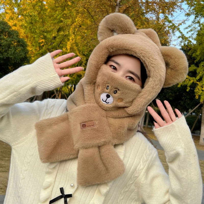 冬のぬいぐるみの帽子のマフラーのマスクの一体の女性のかわいい熊の耳は首を囲んで自転車に乗って防寒して保温します。