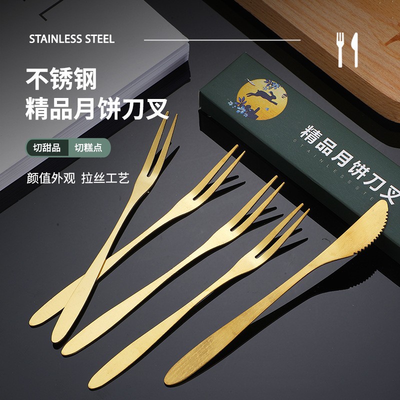 現物304ステンレス月餅ナイフとフォークセットホテルの美しいデザートナイフとデザートフォークの果物とフォークのロゴ