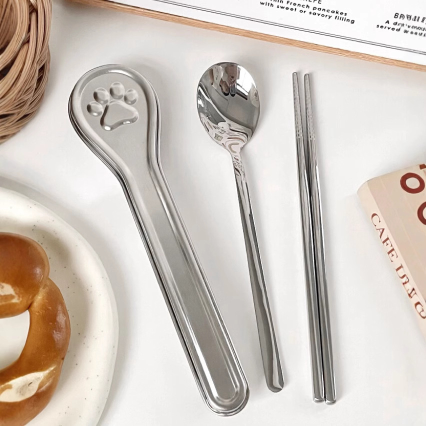 316ステンレス箸スプーンセットかわいい猫爪子供携帯収納ケース食器ケース小学生食器
