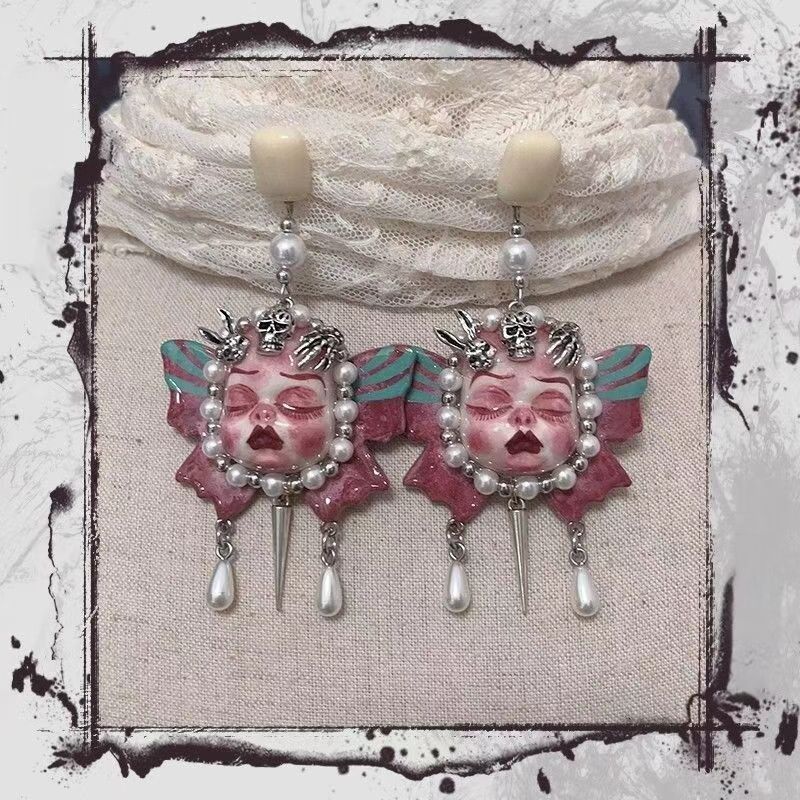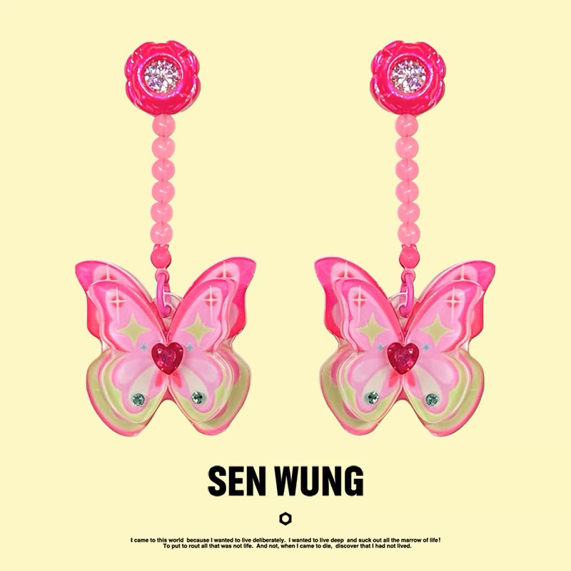【暁夢蝶】グラデーション桃粉立体蝶ビーズピアスかわいい手描き耳クリップ