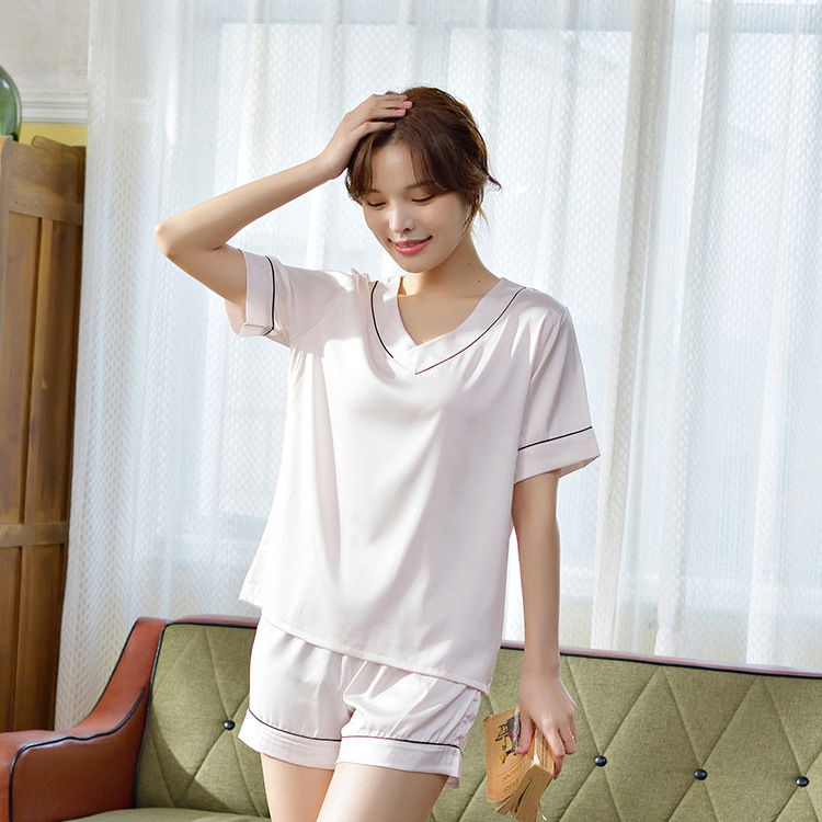 新しいパジャマ女性アイスvネック半袖半ズボンセット夏の高級感サテン家庭服は卸売りができます。