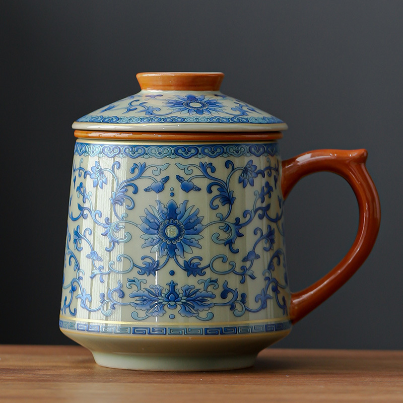 レトロな青花汝窯カップ陶磁器蓋付き茶水分離カップ家庭用個人カップオフィスマグカップ