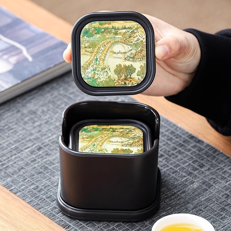中国式吸水電気木カップマット断熱陶磁器マット創意水墨画角型工夫茶器カップホルダー収納ケース付き
