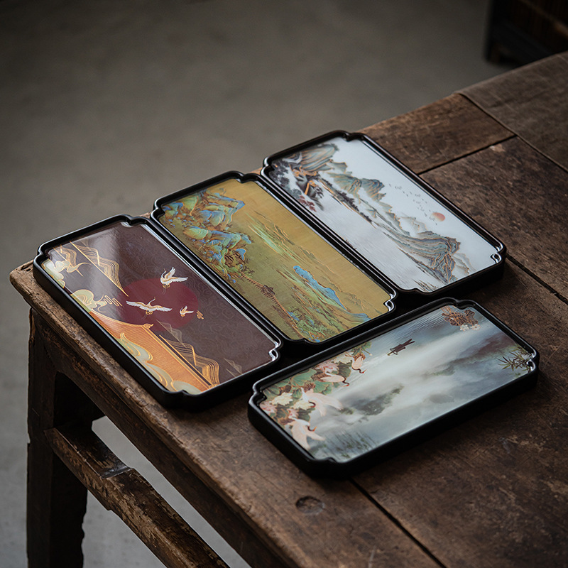 重竹小型実木茶盤家庭用茶器トレー中国式古風山水画工夫乾泡盤茶台茶托