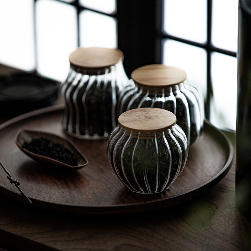 卸売り縦紋ガラス茶葉缶竹蓋密封ガラス缶トランペットミニ携帯コーヒー豆収納缶