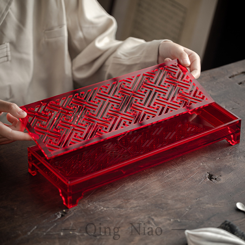 高透紅化粧アクリル茶盤長方形の透かし彫りに湯飲みを入れます。