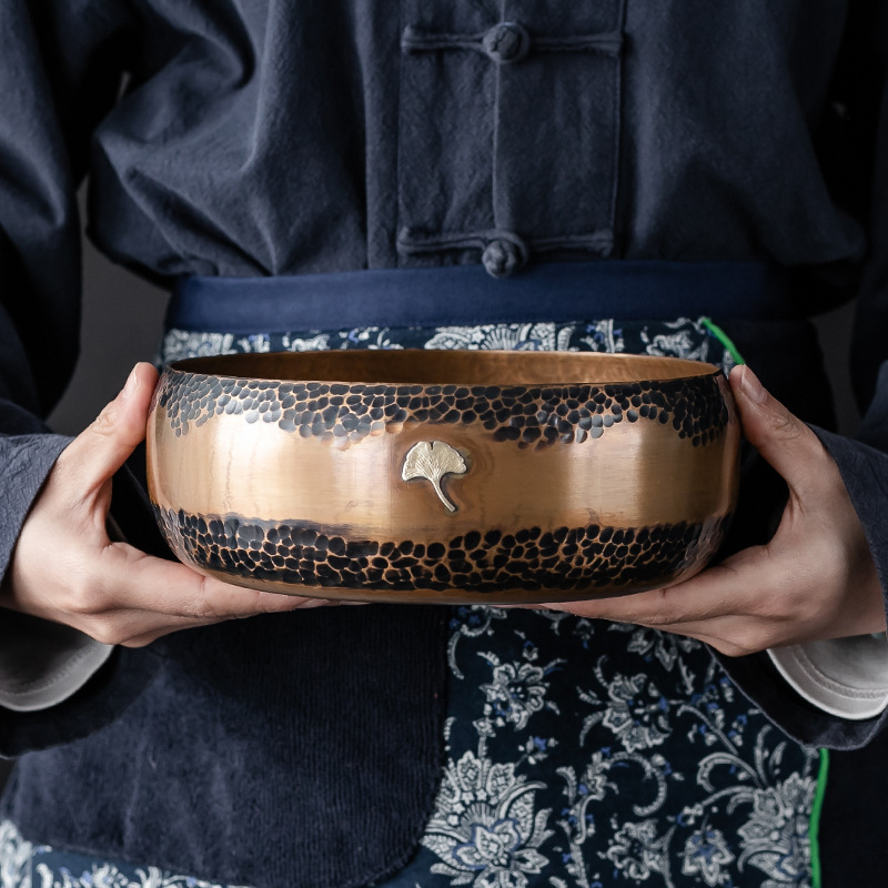 銀杏の葉を手で入れた純銅茶洗い特大サイズの家庭用茶洗いカップ