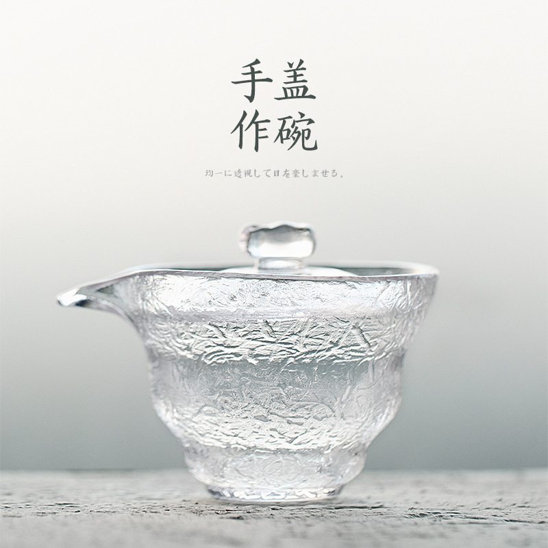 厚い耐熱ガラスの蓋の茶わんのハンマーの目の紋様の茶碗の透明な3才の碗の大きいサイズのお茶を入れる器の工夫の茶器