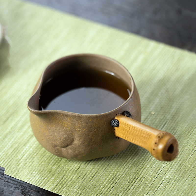 宜興紫砂公道杯竹柄分茶器側は日本式のコップとミルクのコップの茶道の部品を入れて公共の杯を並べます。
