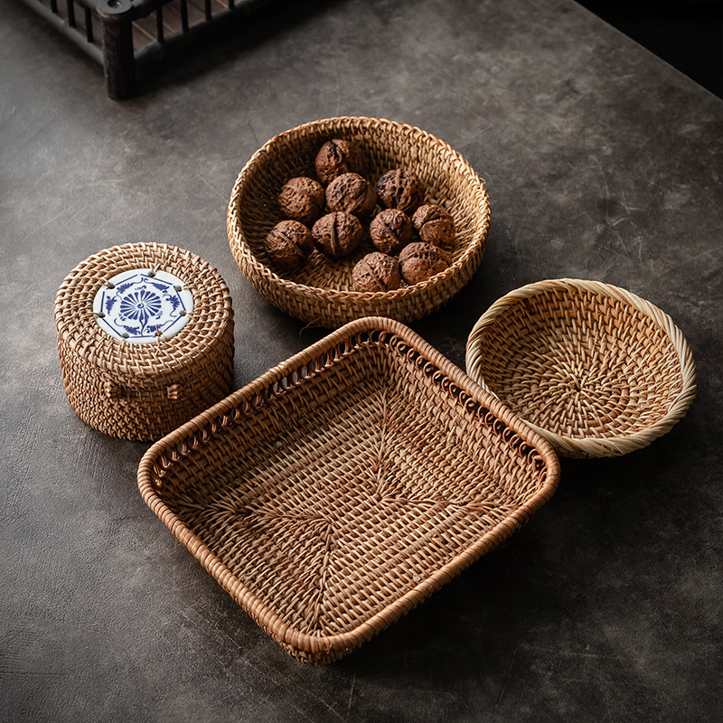 卸売りベトナム手作り藤編収納かご鉄芸茶点皿お菓子キャンディー皿果物かご茶道部品