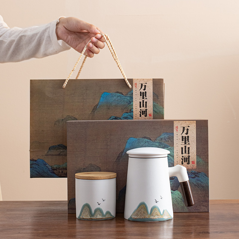 遠山水杯セラミックマグカップフィルター茶水分離カップお湯船ギフトボックス付きオフィスカップストラップ