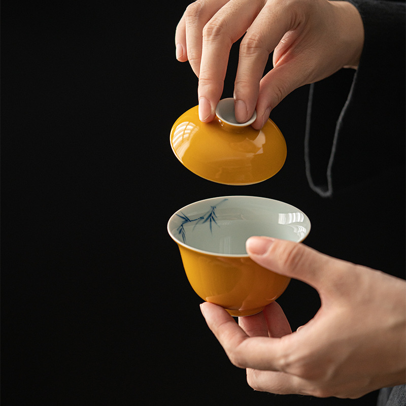文人手描き茶碗中国式黄色原鉱釉薬陶磁器蓋碗擬古杏黄釉青花竹隠茶碗