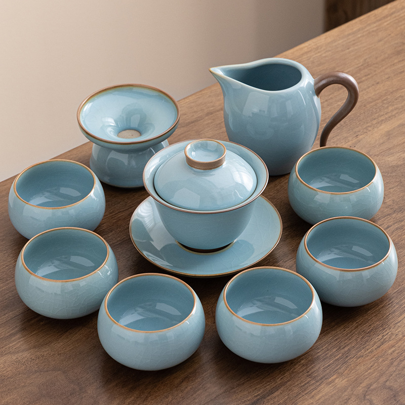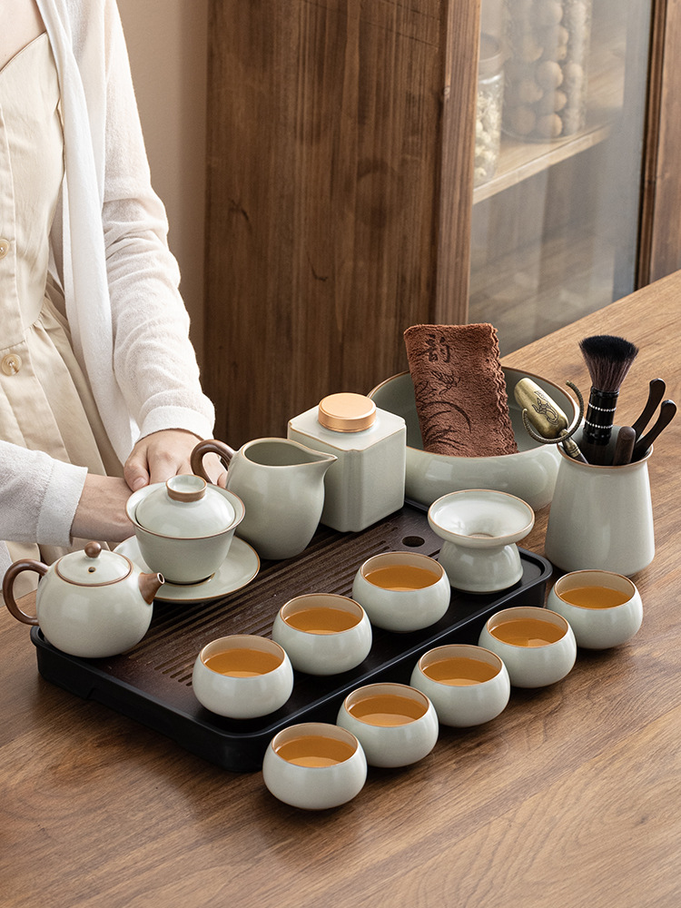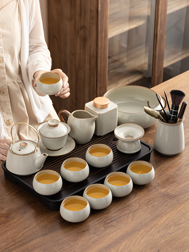 政米黄汝窯カンフー茶器セット家庭用新中国式提梁壺陶磁器蓋碗茶杯会客は豪華です。