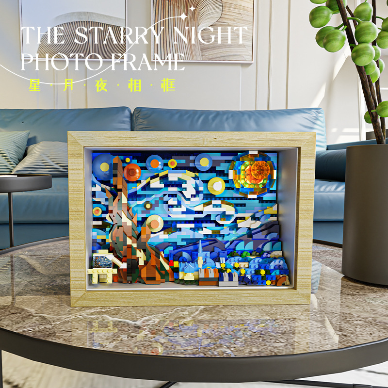 クロスボーダーのゴッホの月夜のフォトフレームの置物の画素の油絵の創意模型の子供は積み木のおもちゃの卸売りをつづり合わせます。