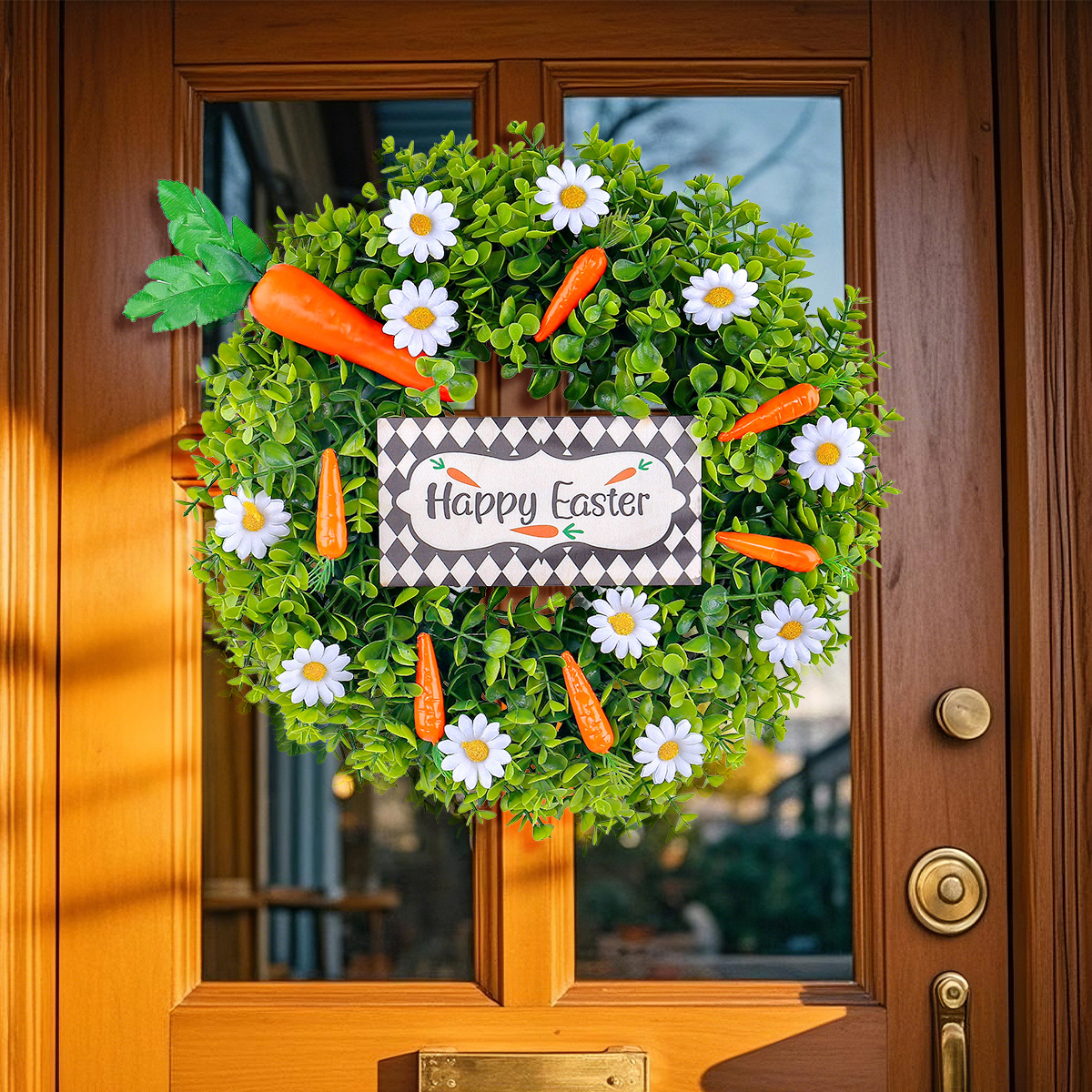アマゾンのイースターの花輪の小さい菊のニンジンのhappy easterのユリの葉の家の扉は装飾を掛けます。