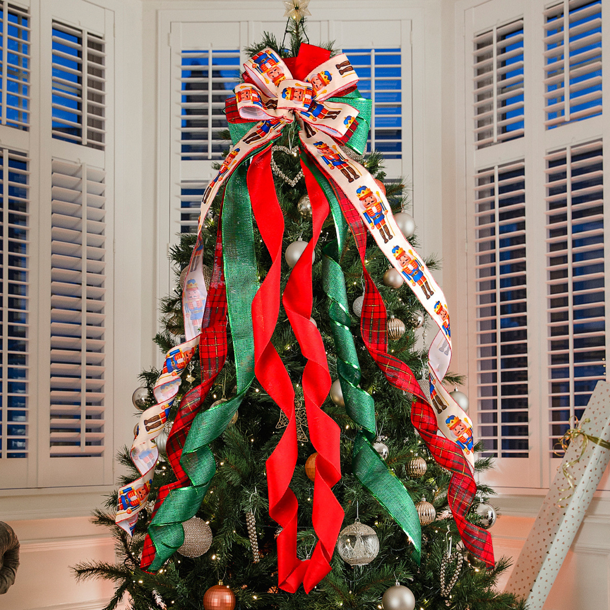 木の頂上の星のクリスマスツリーの蝶結びは2023アマゾンの新型のクリスマスのリボンの掛け物のシーンの配置の道具を飾ります。