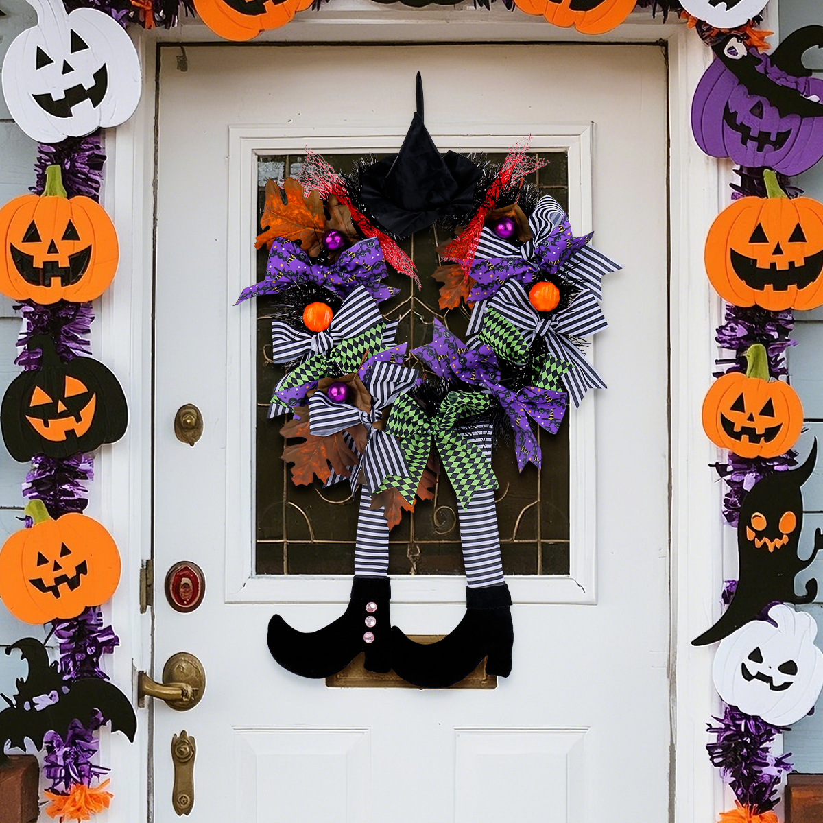 ハロウィーンの魔女の帽子の長い足のカボチャの花輪の扉は国境を越えてお化け屋敷の恐怖の花輪の装飾の掛け物を掛けます。