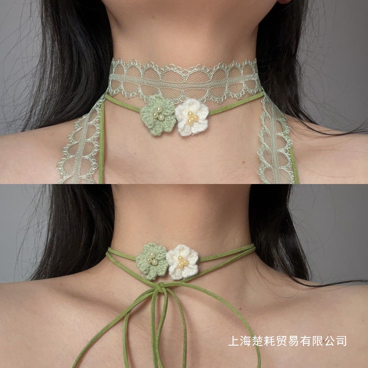 新鮮で甘い気質のグリーンレースフラワーストラップ二層重ねチョーカーネックストラップガールネックレス妖精